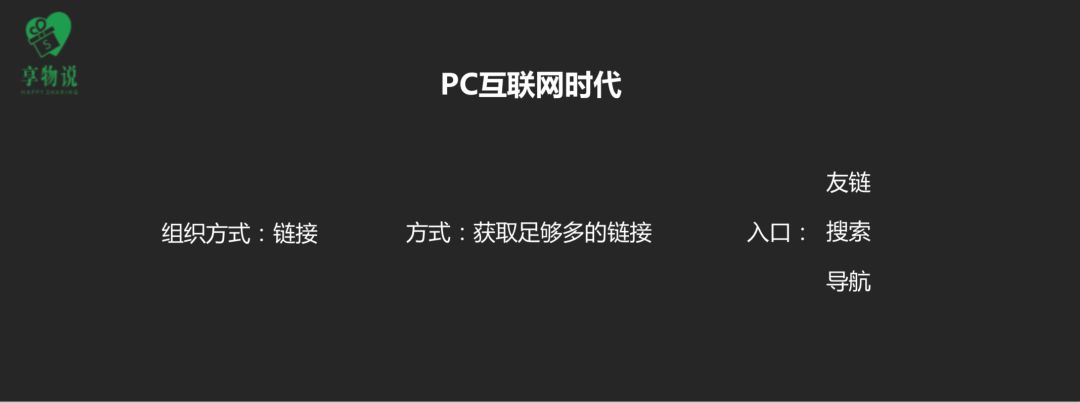 从我自己去做 PC 互联网时代推广和增长这个事情来讲,分三块来看,我们看到在 PC 时代获取信息的时候,用的是 link 的方式,我们所有获取信息的方式是通过域名、通过链接跳转来。