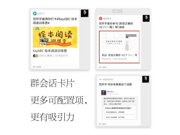 在玩法上,小程序更加的多样化,它可以嵌入一个公众号,也可以贴图文链接、卡片链接。这里你也可以反复做模块测试、A/B test 。如果做的好,结果会有大幅度提升。