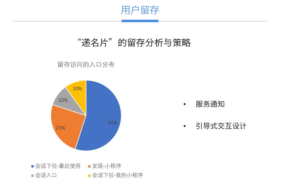目前,递名片大多数用户流量是从会话里进来的。从这个渠道进来的用户我们认为这是被动使用的。它可能不像用户下载一个 app 是因为大致了解这个 app 是做什么的才下载的。
