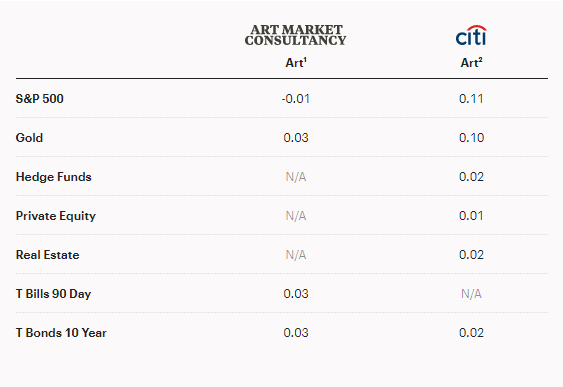根据 Art Market Consultancy 和花旗银行的计算所示,艺术品与其他资产之间的相关性非常低。