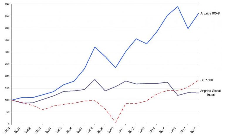 我们可以看到从 2000 年 1 月 1 日至 2018 年 12 月 31 日,Artprice100® 的表现优于 S&P500,涨幅超过 250%。