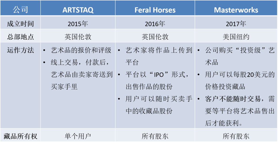 的共享收藏品投资平台还有很多,先是有 Art Rand 的成立,接着出现了 ARTSTAQ,随后还有 Fearl Horses 以及 Masterworks 的出现。