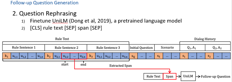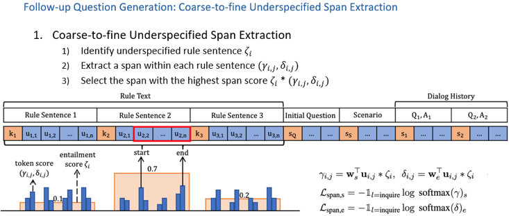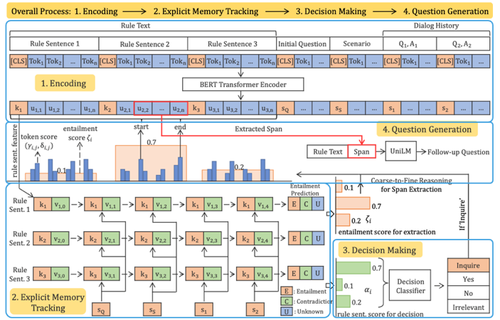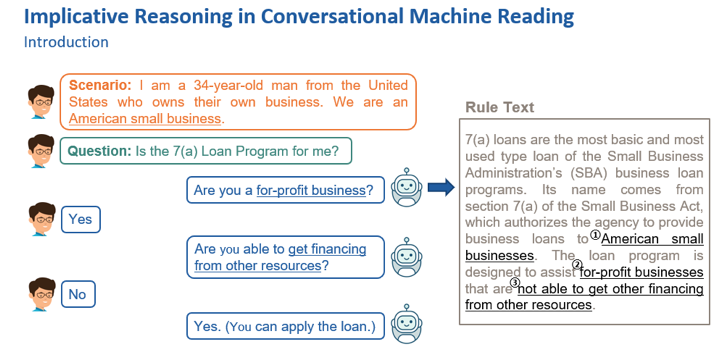 如何在会话式阅读理解里面能够建模它的implicative reasoning,即如何去学习会话与阅读理解篇章之间的蕴含关系。在这篇文章中,讲者概述了两种常见阅读理解的类型:第一种是标准的阅读理解,该模式是指,给定一篇描述型的文章和一个基于事实型的问题,通过匹配文章和问题,从文章中抽取一个span来回答这个问题;第二种是会话式的问答,与标准的单轮问答不同,需要追问新问题,即follow up question,同时问题是以交互的形式出现。会话式问答,存在两个挑战,一个是需要能理解篇章,另一个是能够理解交互的会话本身。基于会话式问答,讲者引入一个例子简单说明(图1)。比如,用户简单描述了自己的情况(Scenario),但用户的问题并不能直接从文章(Rule Text)中获取,往往这个文章可能是一个比较通用的、相当于是一个法规或者法律的篇章。比如,说明能够申请7a贷款的人,需要具备什么样的条件,但针对用户问题在文章中没有直接的答案,必须和用户进行一个交互,才能得到明确的回答。例子中,成功申请贷款的条件有三个,所以还需再问另外的条件。比如,能不能够在别的地方获取它的资金来源,假如用户说no的话,这时候就可以给他一个答案,也就是说你可以申请。因此,在这种情形下,就需要既能够读懂这篇文章,理解文章中的规则,也要能够主动地和用户交互,从用户那边获取一些需要知道的信息,最终再给他一个决策。