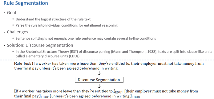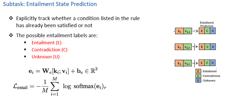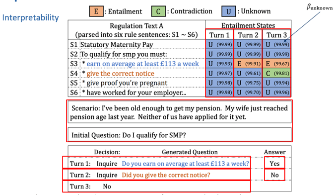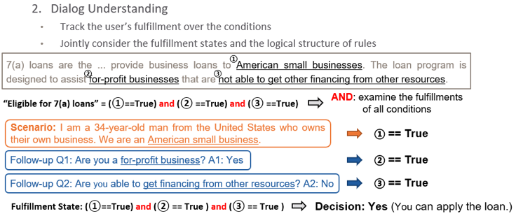 3.1 问题提出负采样进一步,讲者介绍了第二项工作,该工作与前者的侧重点有所不同,存在两个差异:第一,document interpretation,主要由于第一项工作只是简单的对句子进行了一个切分,但实际上有些conditions(比如,上述例子中的American small business for profit business)是长句子中从句的条件,因此,第二项工作侧重如何去理解这样的条件。比如,能申请7(a)贷款,需要满足(①==True and ②==True and ③==True)的条件,这在第一项工作中是没有被建模的。