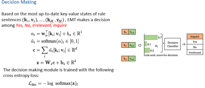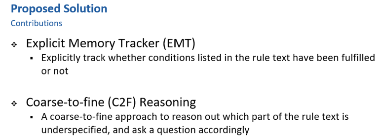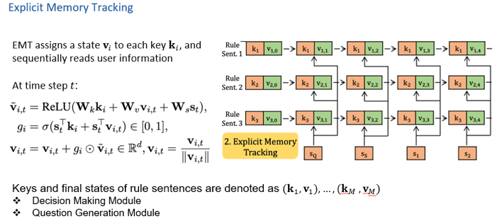 2.1 模型介绍负采样针对于该任务,讲者主要介绍了两项工作,首先是发表于ACL2020的文章“Explicit Memory Tracker with Coarse-to-Fine Reasoning for Conversational Machine Reading”。该工作的贡献有两个:a. 针对决策,提出了explicit tracker,即能够显示的追踪文章中条件是否被满足;b. 采用coarse-to-fine方法抽取Rule Text中没有被问到的规则、条件等。