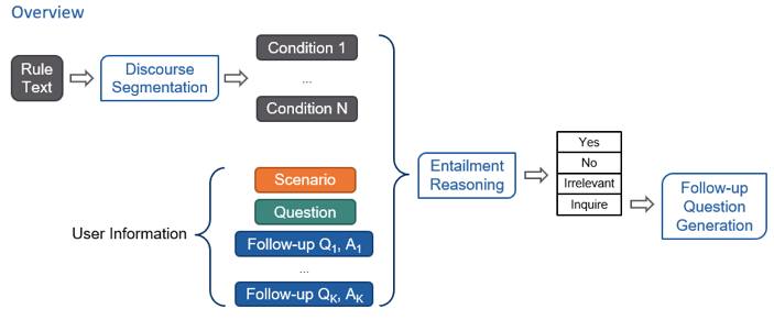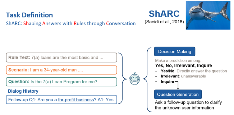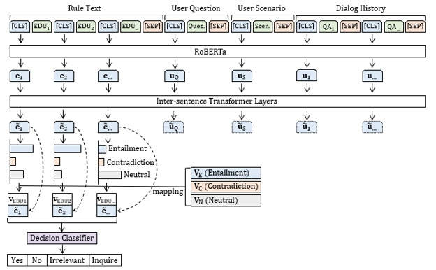 图1定义该项任务常用的数据集是ShARC (shaping answers with rules through conversation 的简称),数据集的设定是:给定Rule Text;用户描述自己的Scenario(Background);用户提出question;已有的问答(Dialog History)。整个过程可以概述为,由于用户给定的background往往不明确,机器需要进行几轮交互,然后从交互中获取一些跟规则有关的信息,然后告诉用户具体答案。整个任务有两个子任务:任务一,整合Rule Text,Scenario,Question以及通过几轮交互从用户获取的信息,作为模型输入,然后做出决策(Decision Making)。该决策包含四种类型:一种是根据现有的信息能够作出yes or no 的决策;或者有些情况下,用户的问题可能与给定Rule Text无关,或根据Rule Text并不能解决问题,则会出现unanswerable的答案;另一种情况是Rule Text中需要满足很多条件,但有些条件机器不确定是否满足,需要作出inquire的决策,主动从用户那里获取更多信息,直至几轮交互后能够作出yes or no的决策。任务二,如果生成的决策是inquire,则需要机器问一个follow-up question,该问题能根据Rule Text引导用户提供一些没有提供的信息,便于进一步的决策。