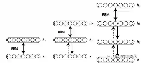 在训练时最下面为第一层结构,相邻两层构成一个 RBM,必须充分训练 RBM 后才能训练下一个 RBM,训练过程如下图所示: