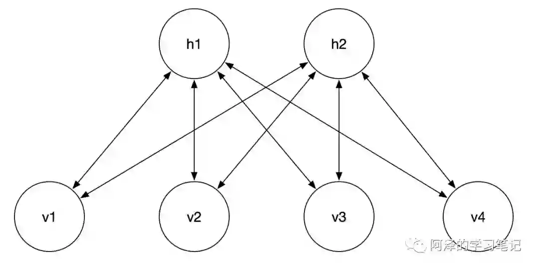 简单介绍一下 DBN,DBN 是由 HInton 大佬在 2006 年提出的一个概率生成模型,其由多个 RBM 组成。所以在介绍 DBN 之前我们先来介绍下受限玻尔兹曼机(Restricted Boltzmann Machines,以下简称 RBM),下图 RBM 的结构图: