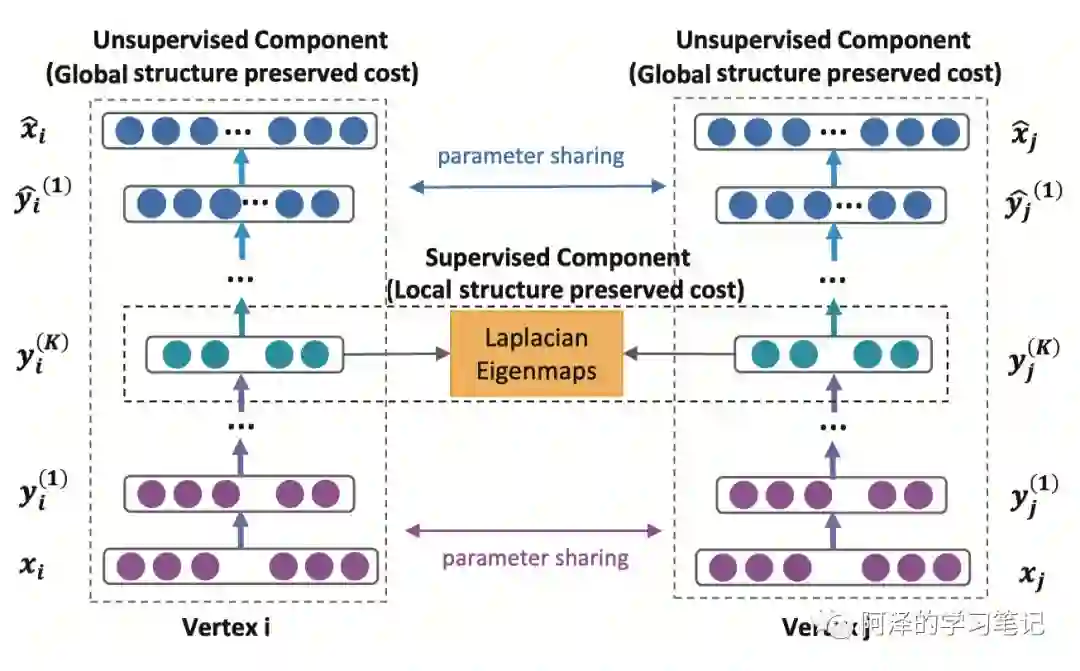 PS:个人猜测:这里框架图虽然画了两个自编码器,SDNE 应该是只有一个自编码器。如果是两个的话,共享参数这个操作过于复杂,而记录邻居节点的 Embedding 向量就比较容易了。
