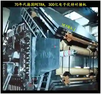 上图是20世纪70年代德国PETRA实验,有300亿电子伏的对撞机。1979年,赵忠尧院士及科学院领导访问Mark-J实验,下方照片中有赵忠尧院士,以及杨保忠、郑志鹏、唐孝威、陈和生、许咨宗。