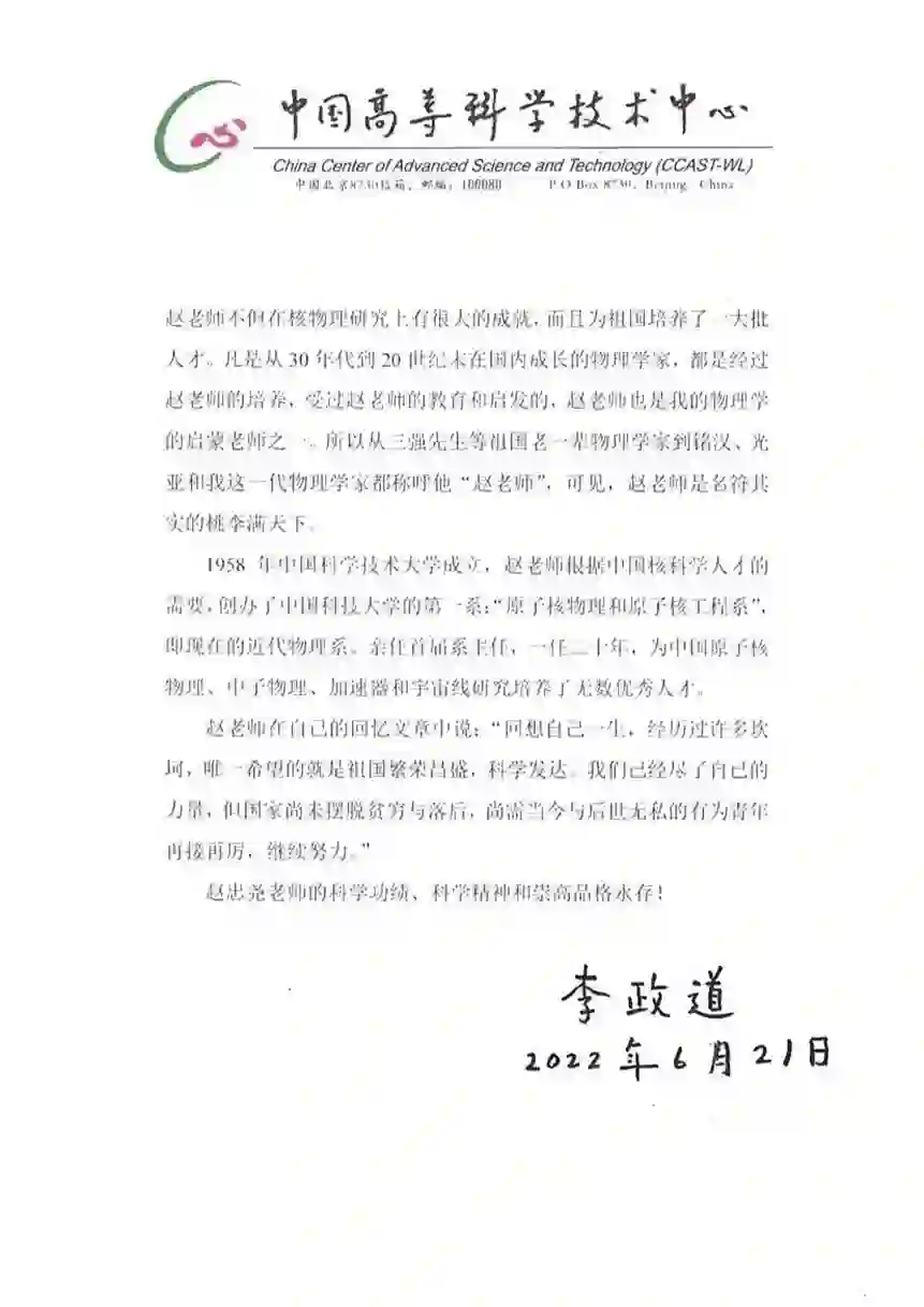 赵老师不但在核物理研究上有很大的成就,而且为祖国培养了一大批人才。凡是从30年代到20世纪末在国内成长的物理学家,都是经过赵老师的培养,受过赵老师的教育和启发的,赵老师也是我的物理学的启蒙老师之一。所以从三强先生等祖国老一辈物理学家到铭汉、光亚和我这一代物理学家都称呼他“赵老师”,可见,赵老师是名符其实的桃李满天下。