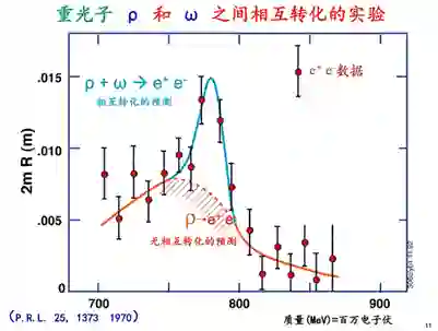 后来我设计了一个新的探测器,发现重光子ρ和ω之间是可以互相转化。这是我们正负电子的数据。这个数据和