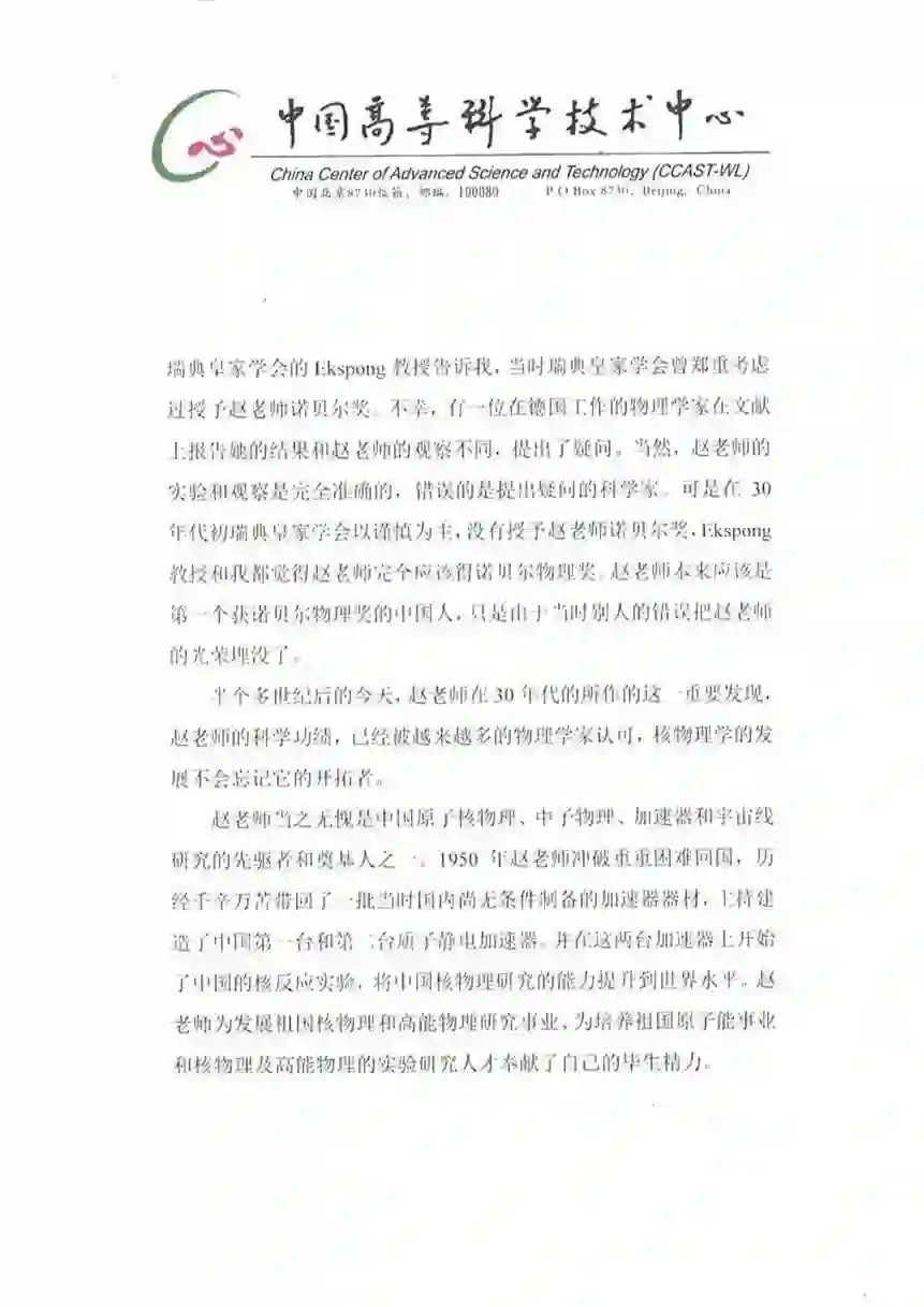 赵老师的实验,对与他同时在加州理工学院的攻读博士学位的同学安德逊有很大启发。两年多后,安德逊在威尔逊云雾室中观测到宇宙线中的反物质——正电子的径迹,他的实验正是在赵老师实验的启发下完成的,为此安德逊教授获得了诺贝尔物理奖。二十多年前,瑞典皇家学会的Ekspong教授告诉我,当时瑞典皇家学会曾郑重考虑过授予赵老师诺贝尔奖。不幸,有一位在德国工作的物理学家在文献上报告她的结果和赵老师的观察不同,提出了疑问。当然,赵老师的实验和观察是完全准确的,错误的是提出疑问的科学家。可是在(20世纪)30年代初,瑞典皇家学会以谨慎为主,没有授予赵老师诺贝尔奖,Ekspong教授和我都觉得赵老师完全应该得诺贝尔物理奖。赵老师本来应该是第一个获诺贝尔物理奖的中国人,只是由于当时别人的错误把赵老师的光荣埋没了。