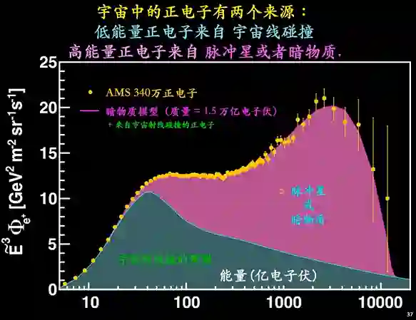 我们发现,宇宙中正电子有两种起源:低能量正电子来自宇宙线碰撞,因为它产生的数量和宇宙线碰撞的预测是相同的。这是10年来收集的340万正电子,从很低的能量到1万亿电子伏。高能量的正负电子来自脉冲星或暗物质。