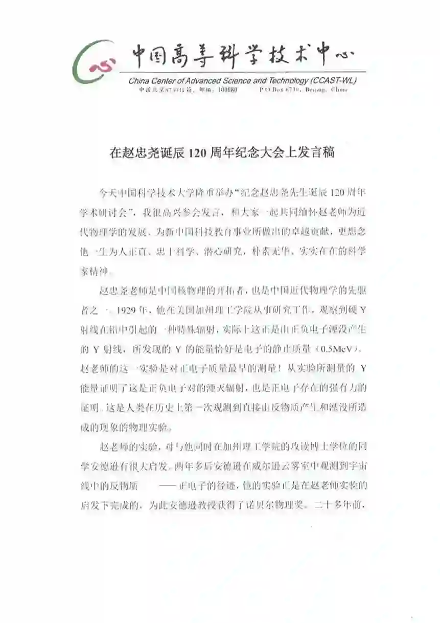 在赵忠尧诞辰120周年纪念大会上的发言