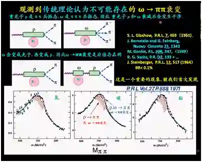 很多人当年讨论这些问题,包括获得诺贝尔奖的格拉肖Glashow和Steinberger。这是一个重要的现象,以前很多人找,都没有发现过,结果我们发现,用氢靶、用碳靶、用铅靶,所得到的结果都是符合ρ,ω→ππ,就是说ω→ππ衰变。只有ρ→ππ衰变,是不符合我们实验数据的。