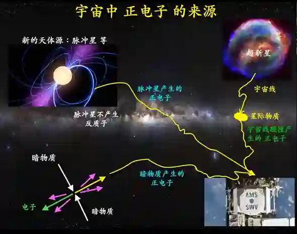 根据现在我们的了解,宇宙中正电子来源有三种。第一,宇宙线和星际物质相碰,宇宙线碰撞产生的正电子。第二,新的天体源——比方说脉冲星,脉冲星可以产生正电子。脉冲星不能产生反质子,因为反质子的重量特别大。第三,暗物质和暗物质相碰,可以产生正电子。所以,有三种正电子来源。