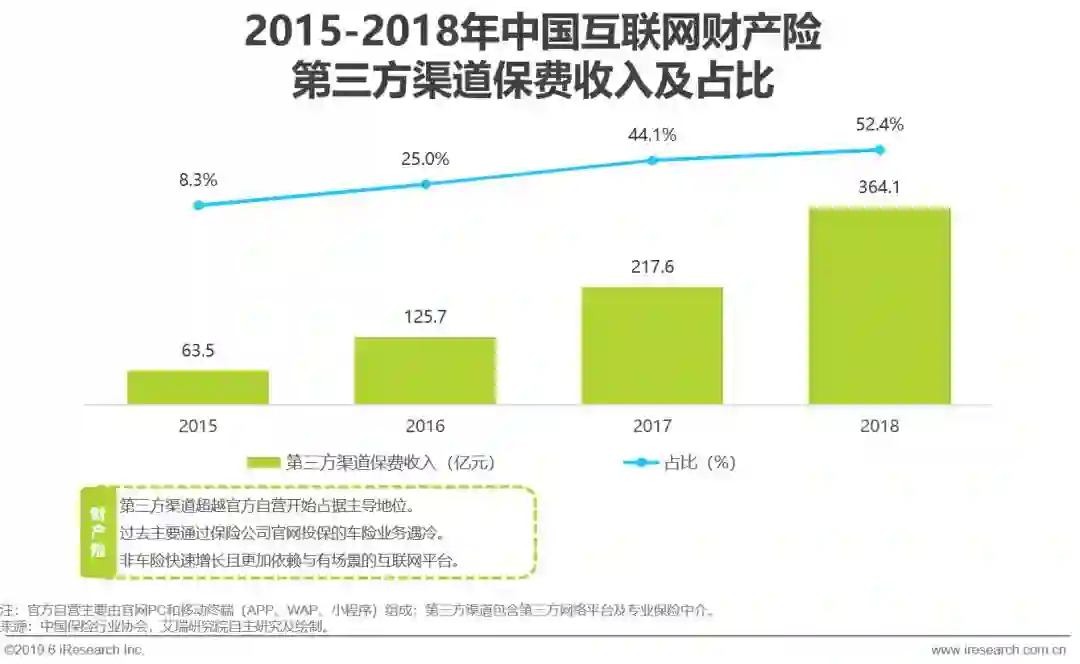 互联网保险销售渠道主要分为官方自营渠道和第三方渠道。从渠道侧市场份额来看,第三方渠道占据互联网保险的主要保费收入来源。得益于互联网保险产品结构的不断优化,在互联网保险整体保费增长疲软的背景下,通过第三方渠道的产生的保费在互联网财产险领域依然保持快速增长。而互联网人身险领域中第三方渠道占比虽然有所下降,但依然占绝对主导地位。相比于官方自营渠道,第三方网络平台拥有更多的用户场景,而专业保险中介能够为用户提供高质量的服务,两者都不仅仅是销售方式的转变,而是赋予了更多互联网保险的核心意义。