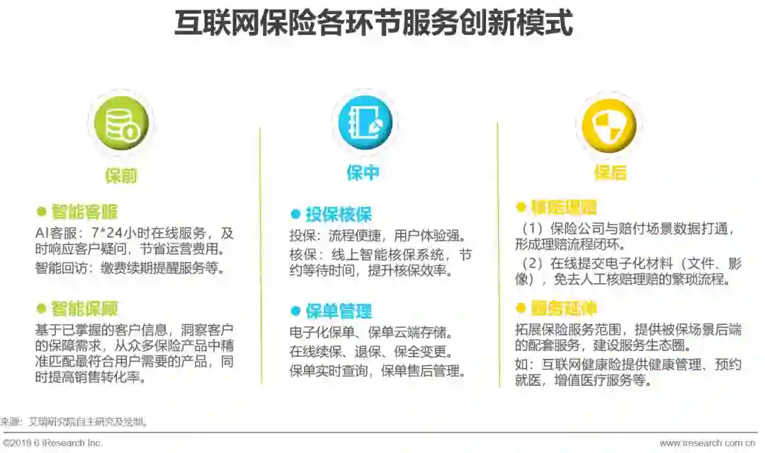 互联网保险在服务领域的创新能够提升用户购买保险的全流程体验,包括产品售前的保险咨询、保险顾问;售中的投保核保、保单管理;售后的便捷理赔及服务延伸,而在渠道和产品创新的基础上,加强服务体系建设,提高用户的保险购买体验也是互联网保险企业提高核心竞争力的必由之路。