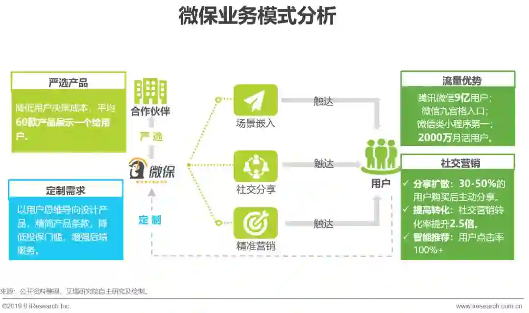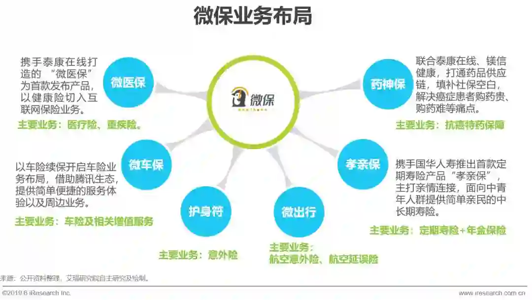 微保业务布局由医疗险出发,逐渐覆盖健康险、意外险、车险、创新险和寿险等多个领域。微保通过对保险产品的打磨,不断设计出普惠、定制的保险产品,渗透了更多用户,同时对用户的风险意识教育也起到了正向推进作用。另外,互联网过去一直被认为只适合销售简单、短期财产险和健康险,而微保2018年上线的孝亲保打开了复杂寿险的互联网市场,依托于微信钱包及社交实现快速传播,也说明了互联网公司在保险领域还有更多新玩法值得期待。