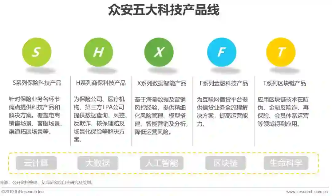 众安保险的业务不仅仅是做保险业务,科技业务同样也是重要的业务板块,众安自成立之日起便重视研发投入,在发展过程中逐渐形成保险科技产品(S)、商保科技产品(H) 、数据智能产品(X) 、金融科技产品(F)和区块链产品(T)五大保险科技产品线,并开始商业化对外输出。