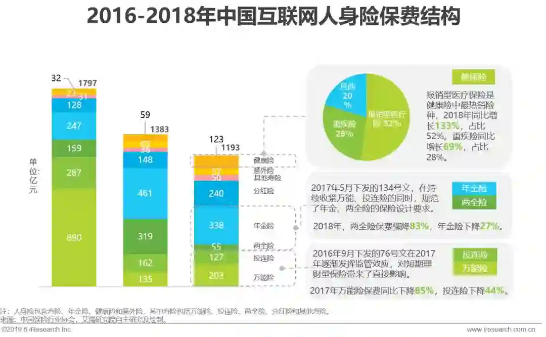 互联网人身险出现连续两年的保费负增长,主要由于发展初期互联网人身险的险种结构过于单一,主要由理财型保险构成,因此在面对行业政策变化时更容易受到影响。细分不同险种来看,寿险业务2018年保费收入为675亿,较2016年下降了55%,而健康险却逆势高速增长,2018年保费收入同比增长108%,成为互联网保险领域发展的唯一亮点。不过目前健康险发展仍然以短期医疗险为主,终身重疾险、定期寿险等更有利于保险公司发展的长期险却难以在互联网渠道打开市场,因此如何由短期险转向长期险发展或许是所有保险公司未来最迫切解决的问题。