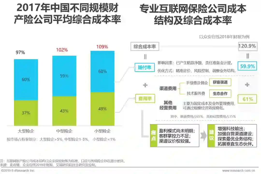 综合成本率是衡量保险公司经营状况的重要指标之一,在传统保险领域,中小保险公司往往在竞争激烈的市场环境下由于无法均摊成本而处于承保亏损的困境。专业互联网保险公司能够独立在互联网上从事保险业务,无需设立线下分支机构,理论上能够降低获客成本和运营成本以解决综合成本率高的问题,不过从市场表现来看,盈利问题仍然困扰着专业互联网保险公司,究其原因主要是发展初期规模化经济尚未体现,另外掌握客群的第三方渠道的往往拥有较高的议价权。