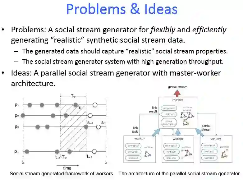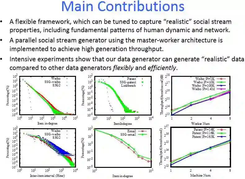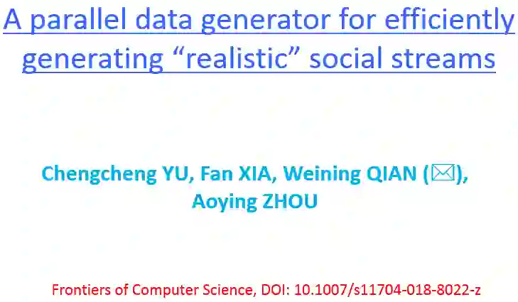 社交流数据指记录了社交实体状态及实体间关系动态变化的数据流。它可以用来表示大量应用中的实体状态变化。由于社交流数据是图数据和流数据的结合,因此对于分析型查询处理、用户行为理解等工作提出了更高的挑战。出于对隐私、数据量庞大不易转移等问题的考虑,一个社交流数据生成器具有重要的意义。本文提出了一个合成社交流数据生成器SSG,使用SSG产生的社交流数据能够与真实数据的多项社交流数据属性相一致,包括基础的用户行为属性和图属性。本文使用多个真实社交流数据进行实验,实验表明SSG能够很好的拟合真实数据,并且能够以稳定的吞吐量和内存消耗来持续的产生社交流数据。此外,本文采用异步模型和延迟更新策略等技术设计并实现了SSG的分布式版本。实验表明,分布式SSG产生数据的吞吐量能够随着节点的增加而呈线性增长。