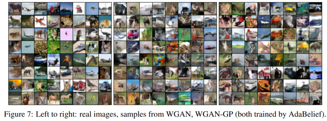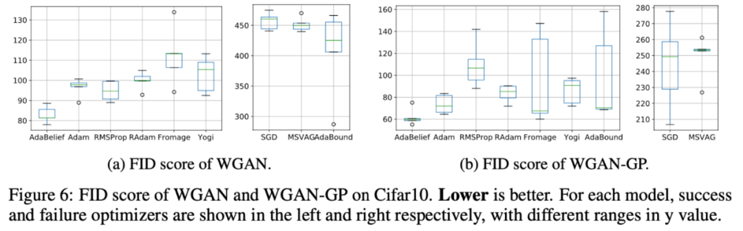 研究者利用Wasserstein-GAN(WGAN)和WGAN-GP进行了实验。对于每个优化器,在其最佳超参数设置下,研究者进行了5轮实验,实验结果如图6和图7所示。AdaBelief明显由于其他优化器,并且其FID分值最低。