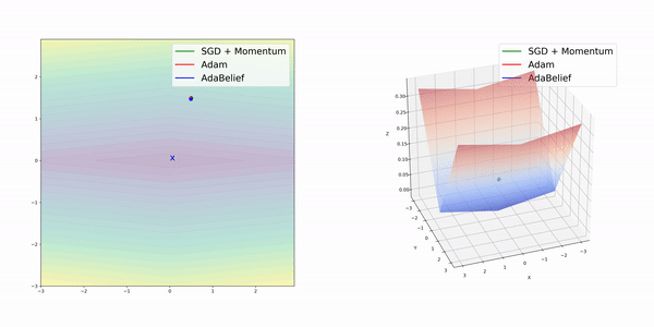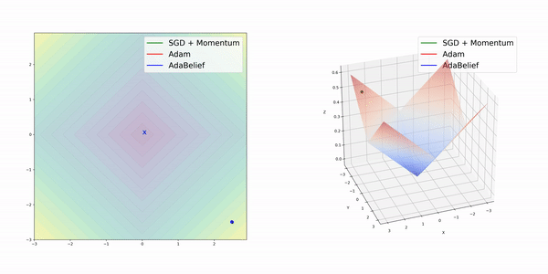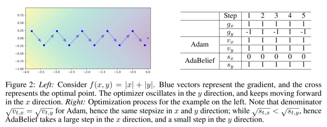 因此,它在x方向和y方向上步长一样。但在AdaBelief 中,