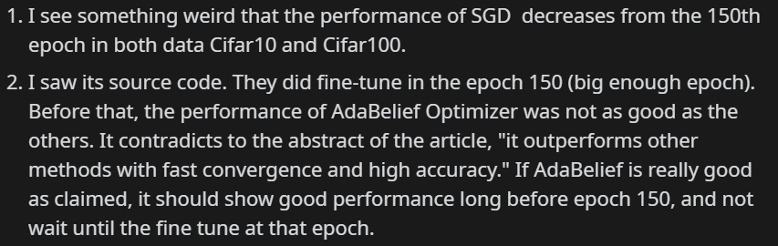 虽然效果看起来不错,但论文发布后也引发了一些质疑,比如:「在Cifar10和Cifar100的数据中,SGD的性能在150个epoch之后才开始下降。他们在150个epoch处进行了微调。在此之前,AdaBelief并没有其他优化器性能好。」