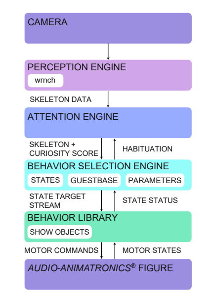 行为选择引擎是机器人角色系统的组成部分,它代表角色的高级推理。该组件包含一个手工制作的状态机,用于指导机器人处于哪种行为状态。行为选择引擎还维护有关机器人参数的信息(例如,当前状态,好奇阈值,状态超时时间),以及摄像头看到的骨架。