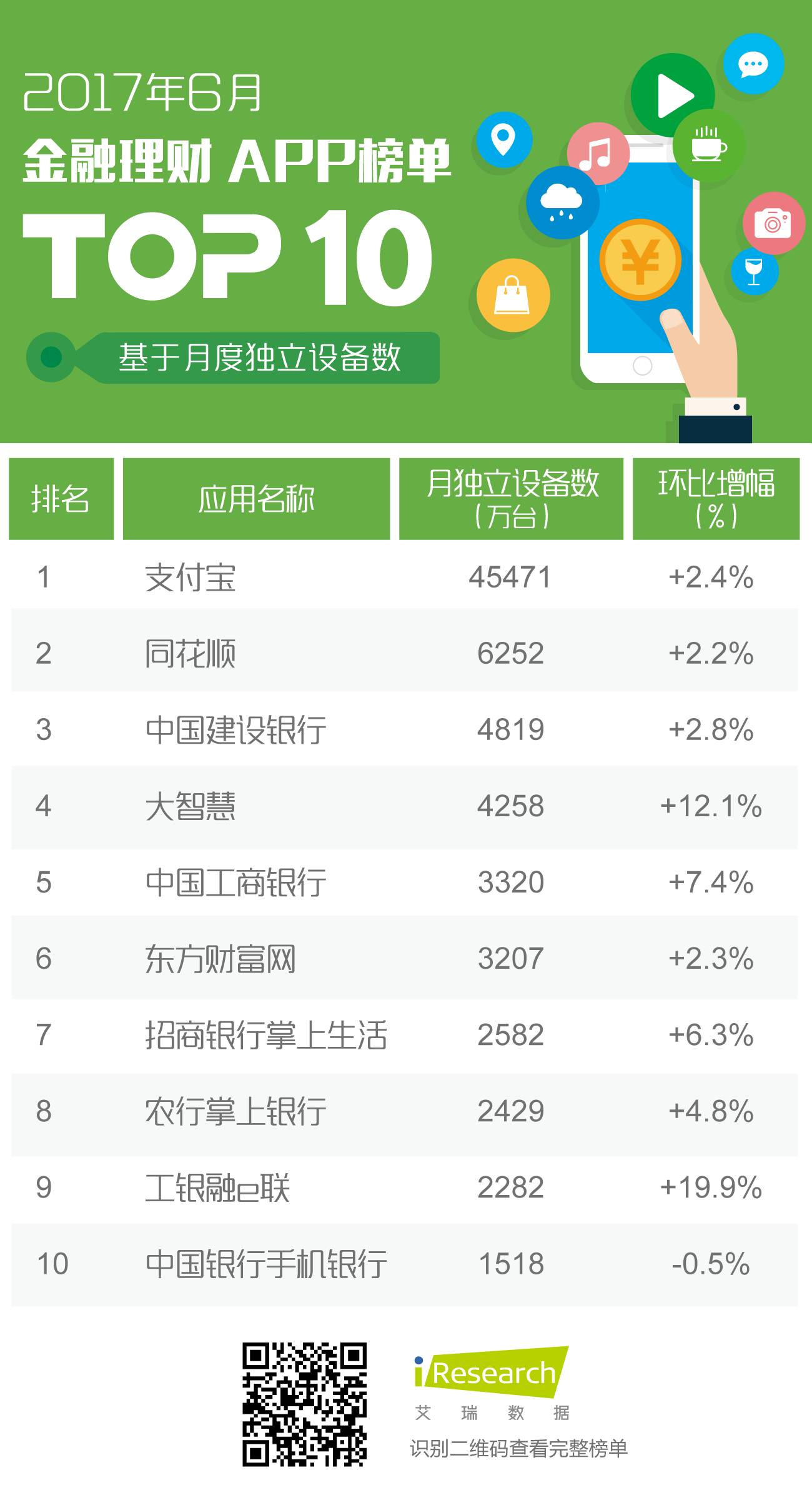 与五月比,金融理财类TOP10成员排序基本稳定,共计包括6个银行类APP、3个股票类APP以及1个支付工具,其中,支付宝以4.5亿的月独立设备数仍旧高居榜首。银行类APP中,伴随着大量暑期优惠活动的推出,工银融e联和中国工商银行APP月独立设备数的增长率较高,分别达到19.9%和7.4%;股票类APP中,大智慧APP的增长率从五月的-3.0%扭负为正达到12.1%,而同花顺和东方财富网的增长率则略有放缓。
