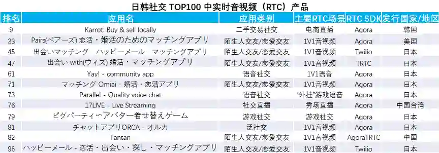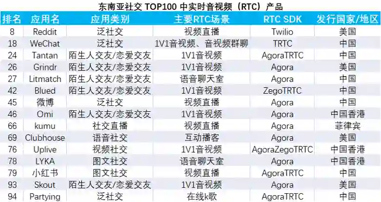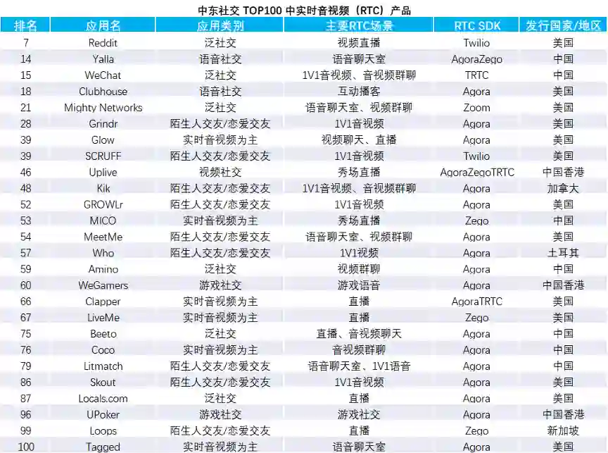 我们挑选了2022年1月data.ai在中东、东南亚、日韩、美国等区域市场活跃用户数排名TOP100的社交软件,筛选其中使用RTC技术的应用来进行分析。