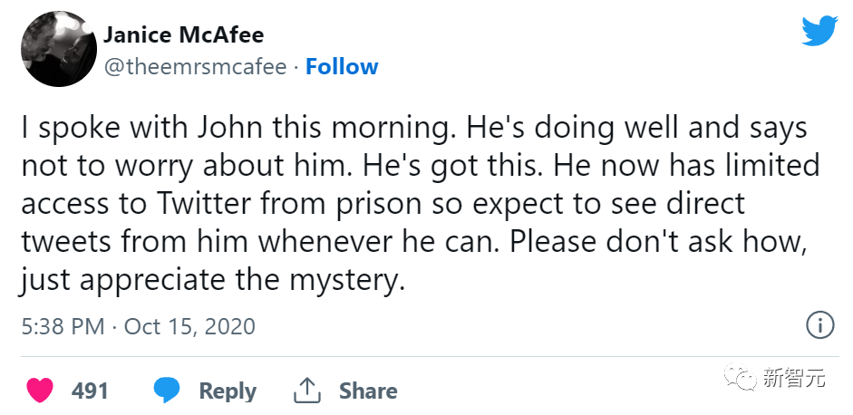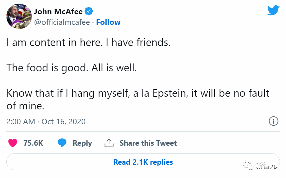 据当时媒体报道,入狱后的麦卡菲在牢里还在更新推特,说自己状态不错,食物不错,但表示如果最后的结局是自己上吊,就像爱泼斯坦那样,那「肯定不是我的错」。
