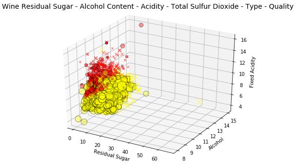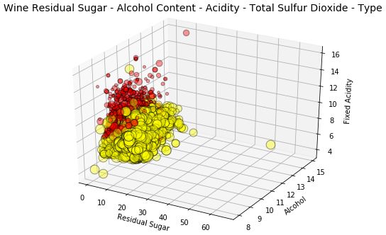 t = fig.suptitle('Wine Residual Sugar - Alcohol Content - Acidity - Total Sulfur Dioxide - Type', fontsize=14)