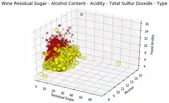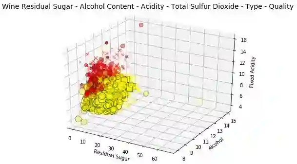 这可是在一张图上画出 6 维数据!我们用形状表征葡萄酒的质量标注,优质(用方块标记),一般(用 x 标记),差(用圆标记):用色调表示红酒的类型,由深度和数据点大小确定的酸度表征总二氧化硫含量。