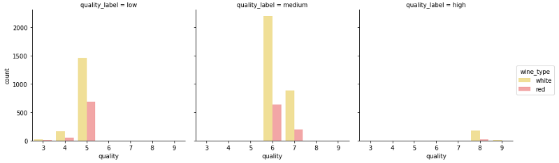 col_order=['red', 'white'], hue_order=['low', 'medium', 'high'],