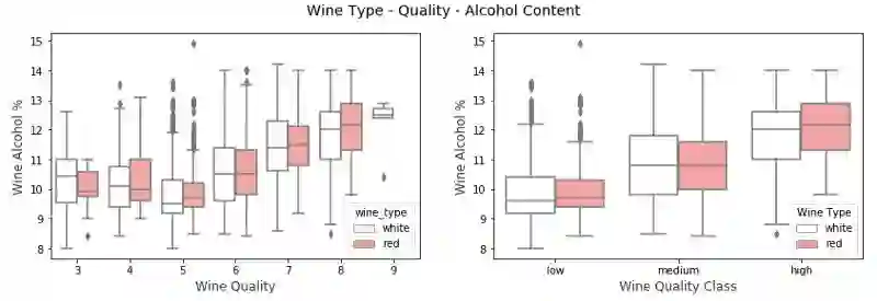我们可以看到,对于质量和 quality_label 属性,葡萄酒酒精含量都会随着质量的提高而增加。另外红葡萄酒与相同品质类别的白葡萄酒相比具有更高的酒精含量(中位数)。然而,如果检查质量等级,我们可以看到,对于较低等级的葡萄酒(3 和 4),白葡萄酒酒精含量(中位数)大于红葡萄酒样品。否则,红葡萄酒与白葡萄酒相比似乎酒精含量(中位数)略高。