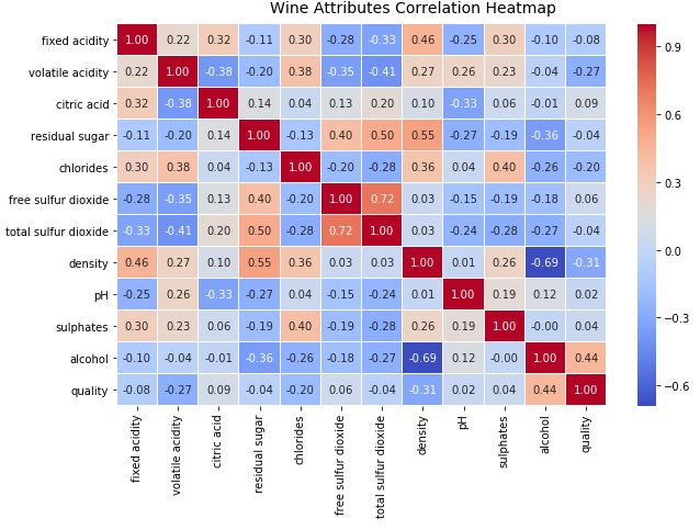 t= f.suptitle('Wine Attributes Correlation Heatmap', fontsize=14)