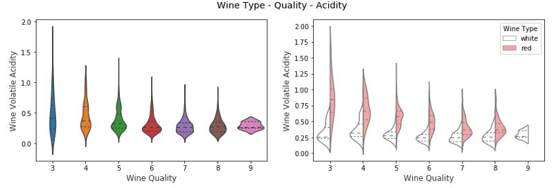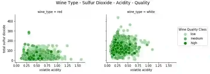我们清楚地看到,高品质的葡萄酒有较低的二氧化硫含量,这是非常相关的,与葡萄酒成分的相关领域知识一致。我们也看到红葡萄酒的二氧化硫总量低于白葡萄酒。在几个数据点中,红葡萄酒的挥发性酸度水平较高。