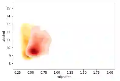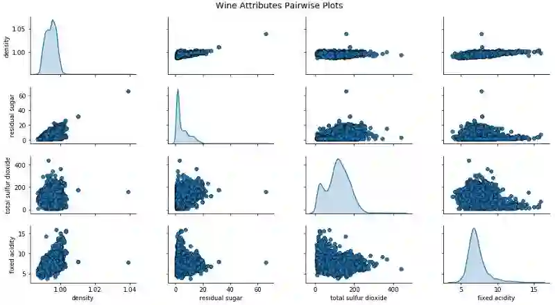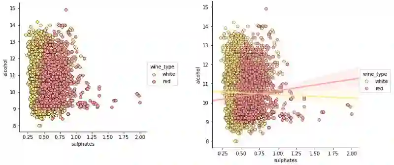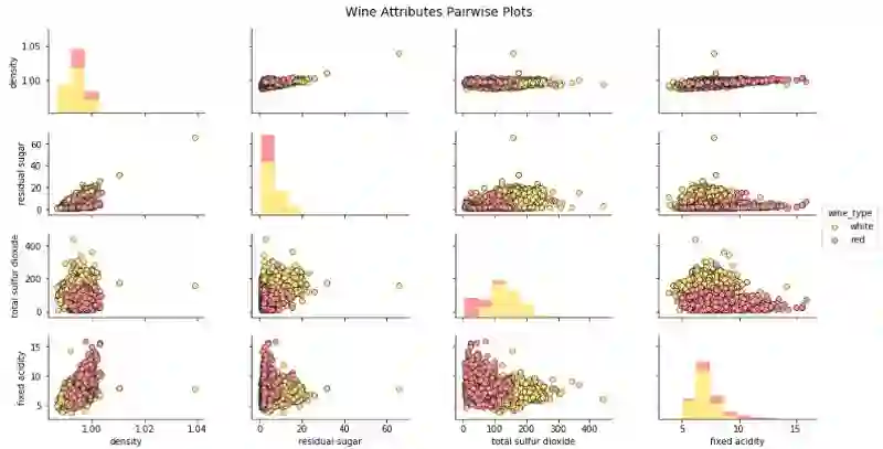 wine_type 属性由上图中的色调表征得相当明显。此外,由于图的复杂性,解释这些可视化开始变得困难,但我们仍然可以看出,例如红葡萄酒的固定酸度更高,白葡萄酒的残糖更高。当然,如果酒精和固定酸度之间有某种联系,我们可能会看到一个逐渐增加或减少的数据点趋势。