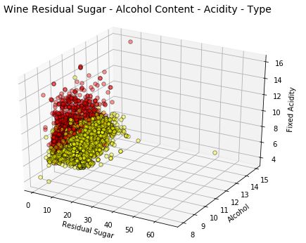 t = fig.suptitle('Wine Residual Sugar - Alcohol Content - Acidity - Type', fontsize=14)