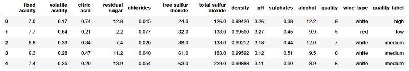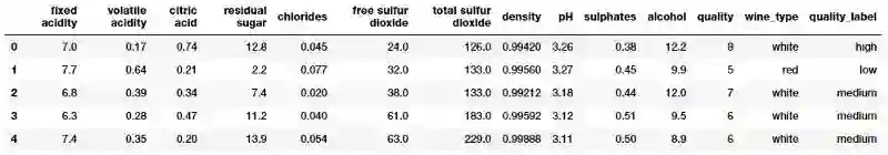 我们通过合并有关红、白葡萄酒样本的数据集来创建单个葡萄酒数据框架。我们还根据葡萄酒样品的质量属性创建一个新的分类变量 quality_label。现在我们来看看数据前几行。