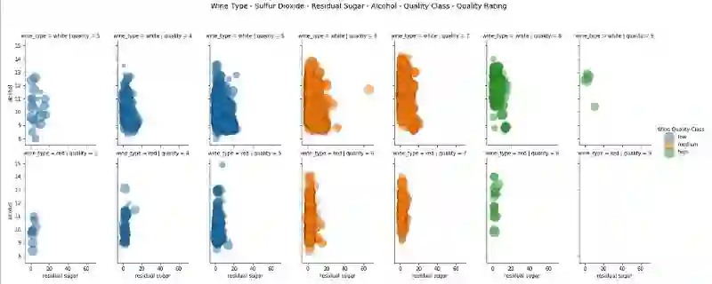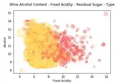 我们用色调代表 wine_type 和数据点大小代表残糖。我们确实看到了与前面图表中观察到的相似模式,白葡萄酒气泡尺寸更大表征了白葡萄酒的残糖值更高。