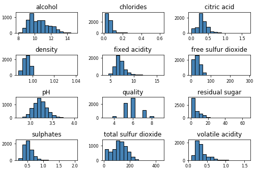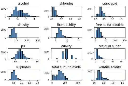 wines.hist(bins=15, color='steelblue', edgecolor='black', linewidth=1.0,
