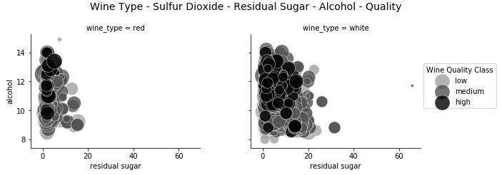 fig.suptitle('Wine Type - Sulfur Dioxide - Residual Sugar - Alcohol - Quality Class - Quality Rating', fontsize=14)