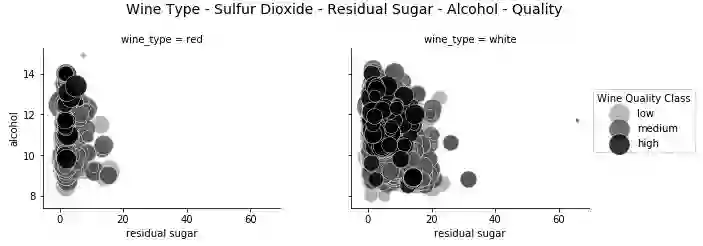 气泡图灵感来源与上文所述一致。但是,我们还可以看到以二氧化硫总量为指标的点数,发现白葡萄酒的二氧化硫含量高于红葡萄酒。