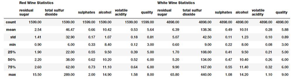 pd.concat([rs, ws], axis=1, keys=['Red Wine Statistics', 'White Wine Statistics'])