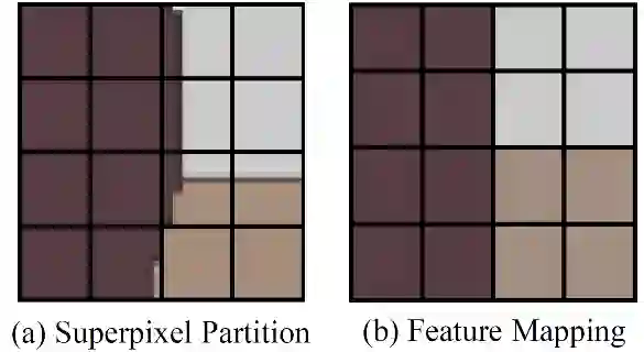 (4)卷积网络和图网络之间的特征映射:卷积神经网络可以保存物体和部件的位置信息,而图神经网络可以非常便利地实现局部和整体的多尺度信息交互。我们将主干卷积神经网络的编码部分中的多尺度特征映射进入图神经网络,然后将经过信息融合特征由图神经网络映射进入特征金字塔网络的解码部分。图2展示了如何利用超像素分割实现特征在卷积神经网络和图神经网络之间的映射。